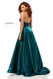 Rich metallic satin A-line dress with V neckline and spaghetti straps.