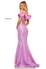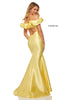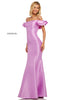 Mikado mermaid dress with ruffled off-the-shoulder neckline and cut out back.