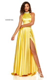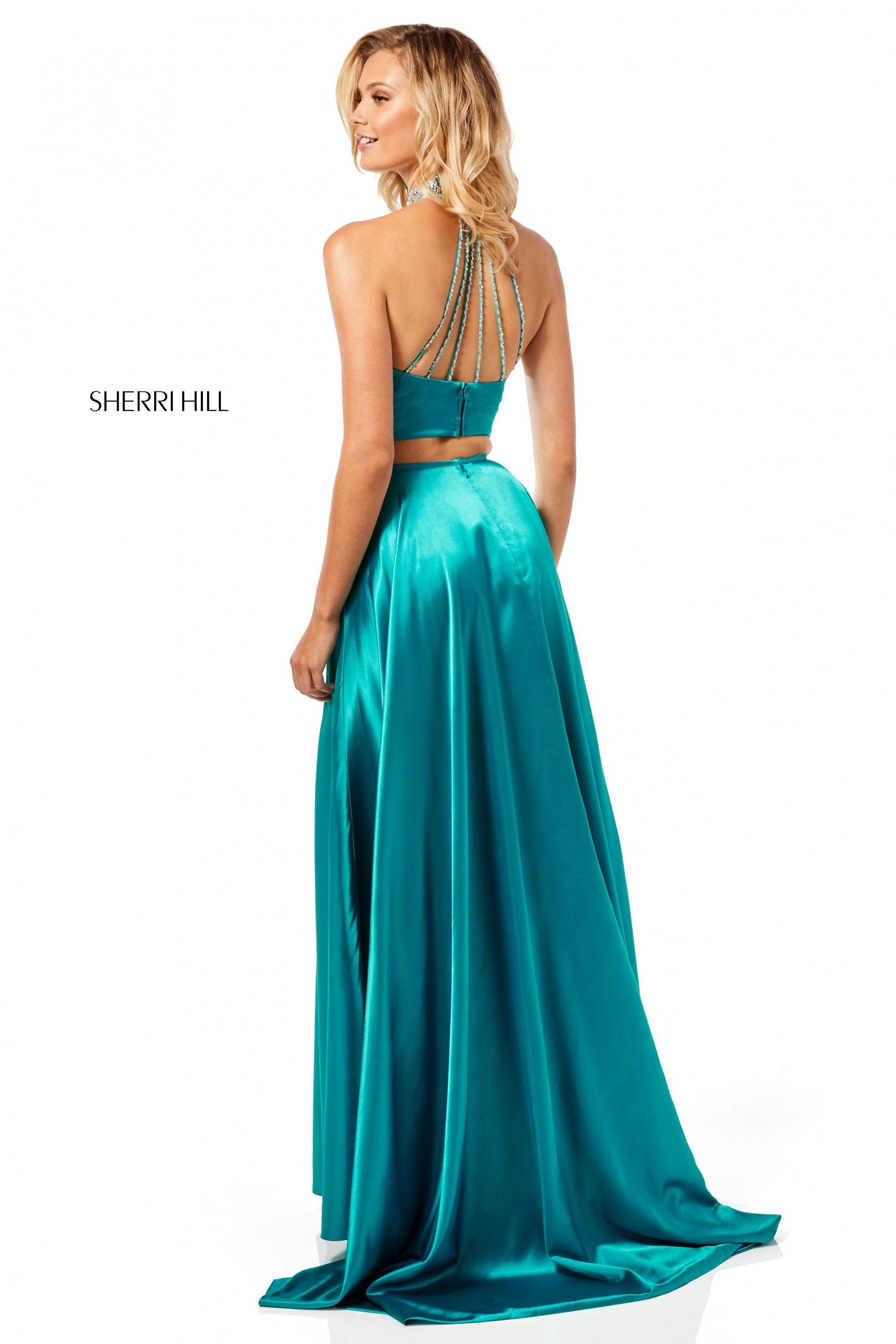 Silk charmeuse two-piece with a high neck bodice and slit in the skirt.