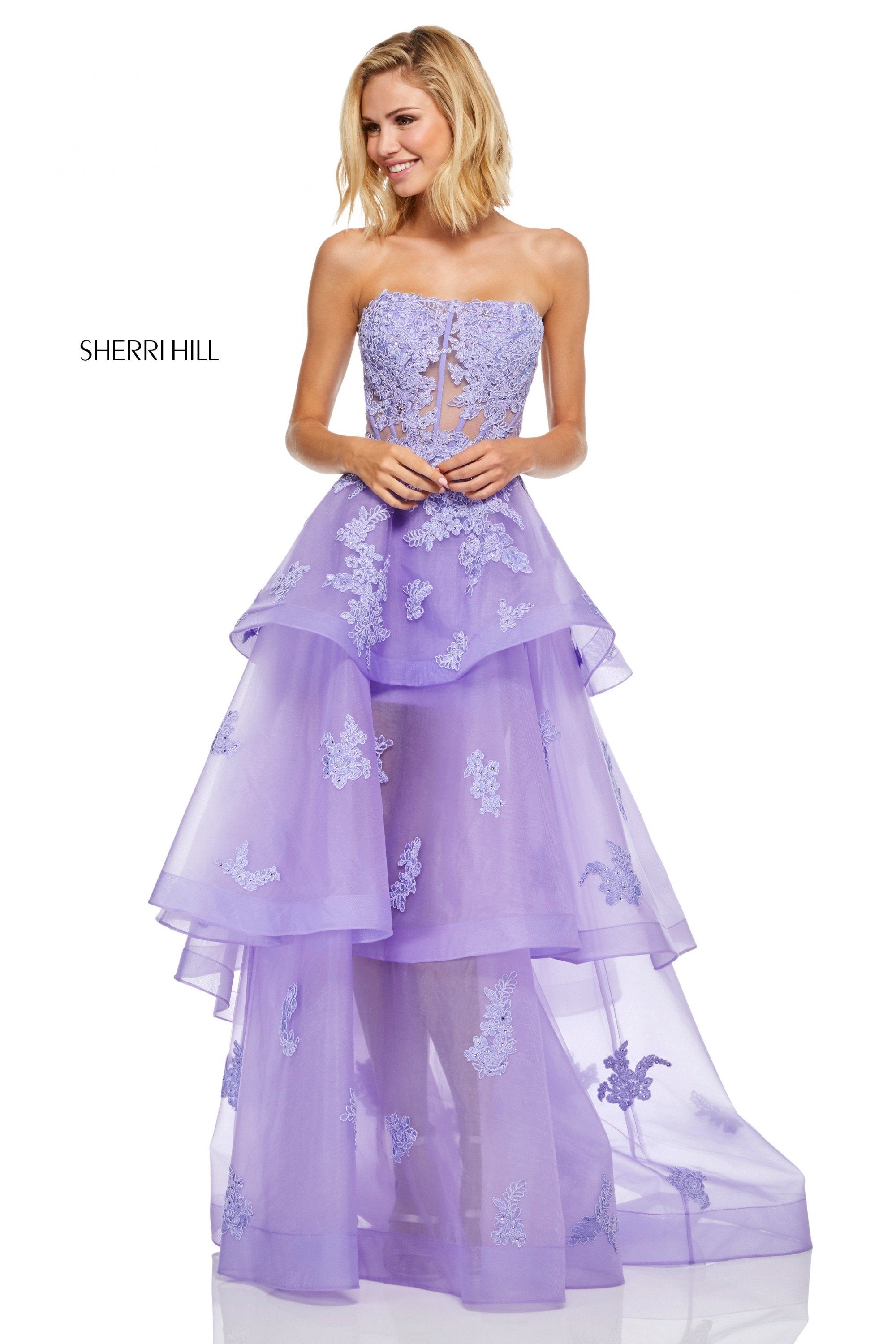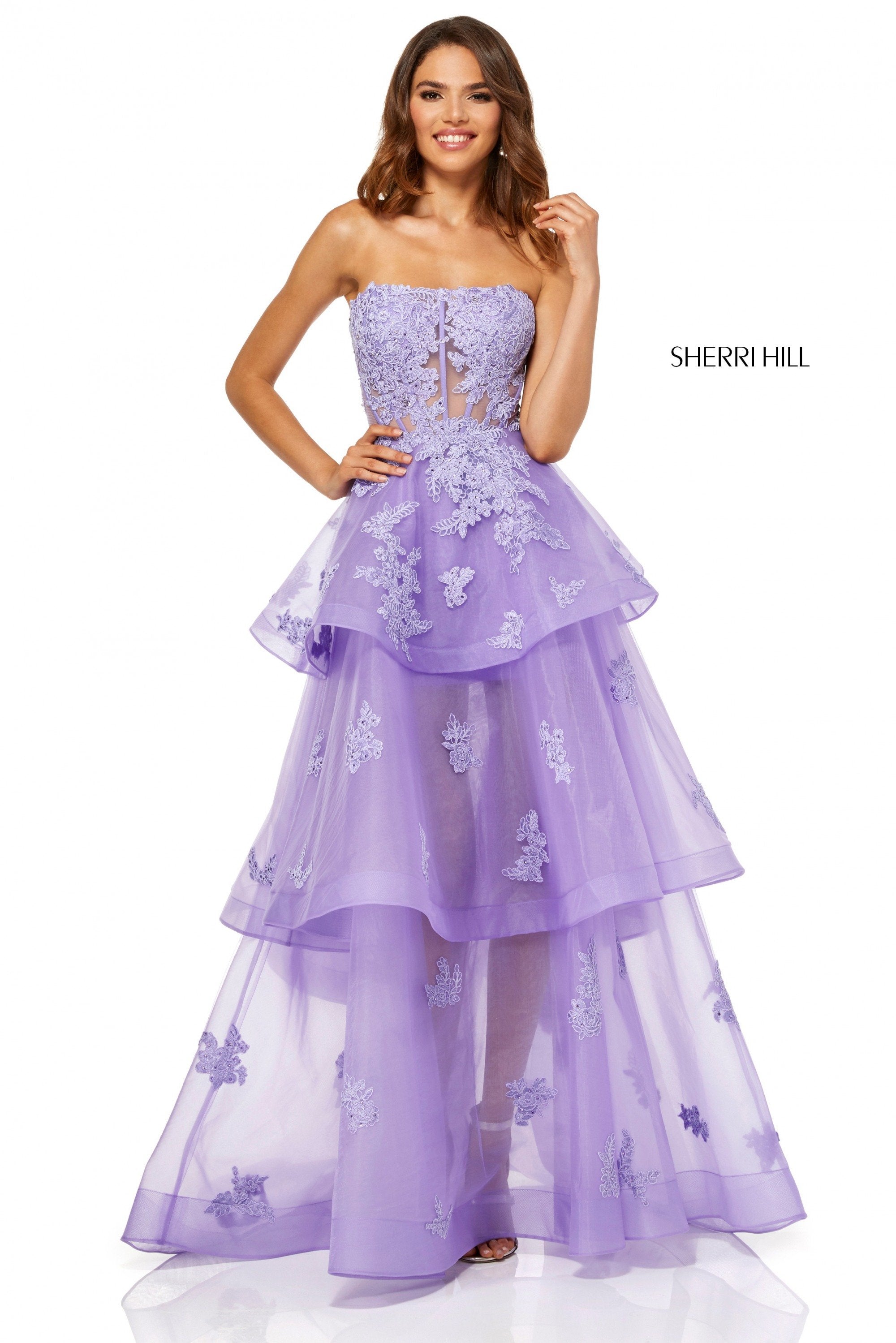 Strapless lace ball gown with layered tulle skirt.