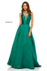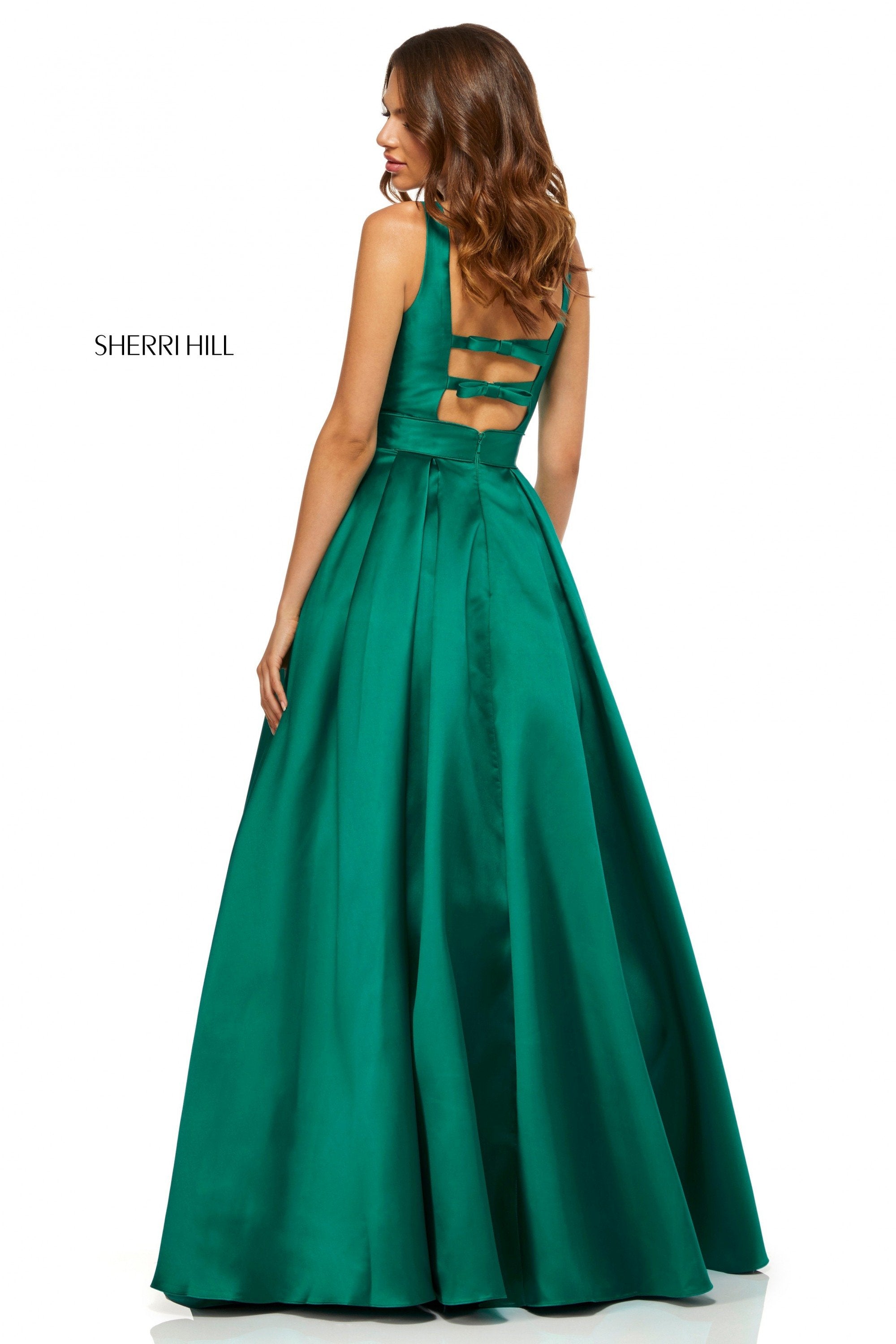 Satin A-line dress with plunging neckline and back straps with bows.