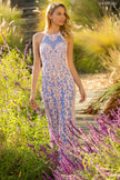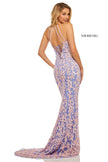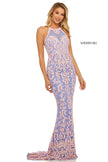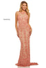 Fully beaded gown with a high neck bodice and lace up back.