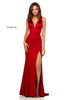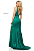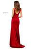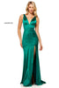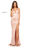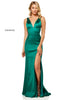 Satin V-neck sheath dress with side slit.