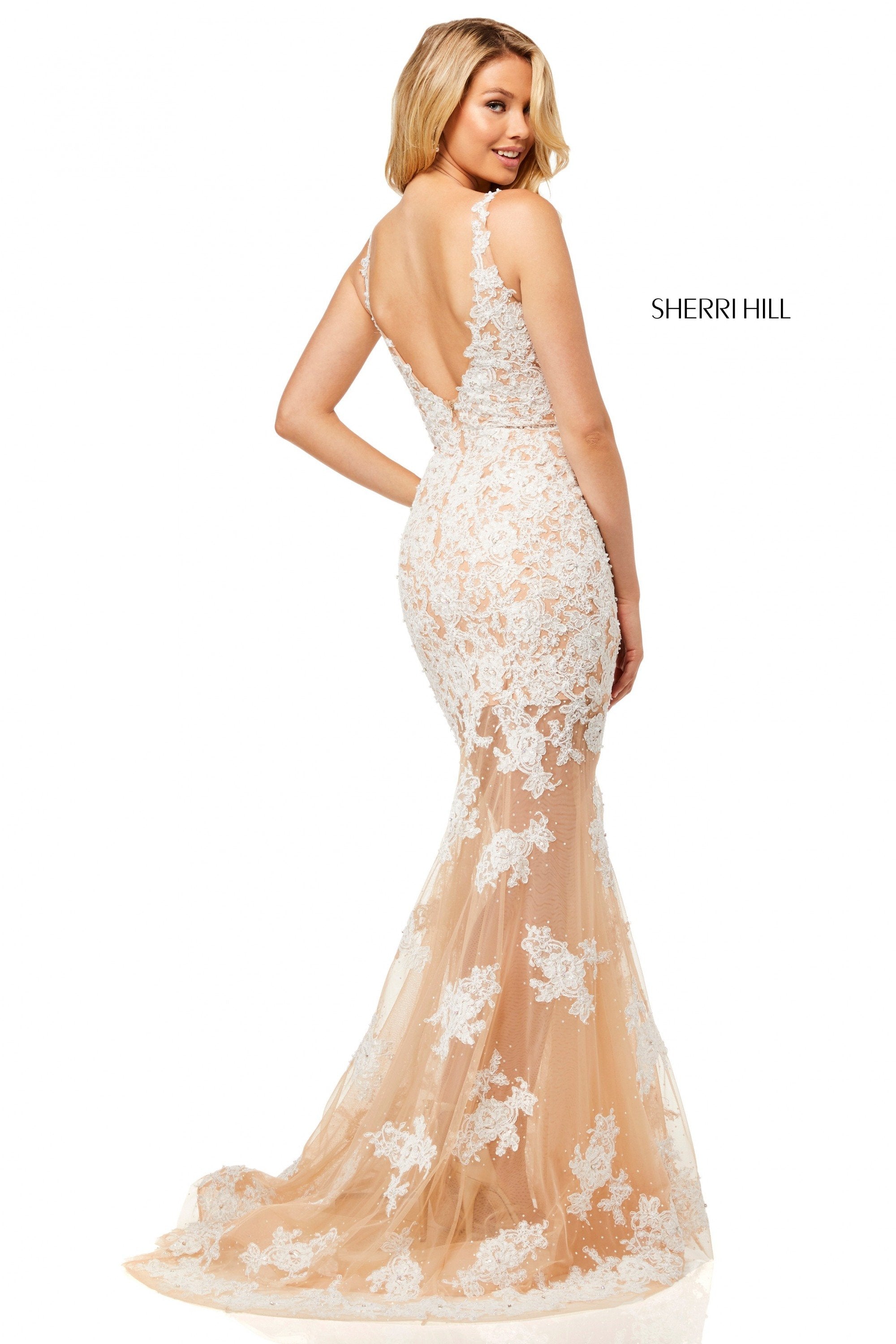 Lace V-neck mermaid with a sheer skirt.