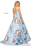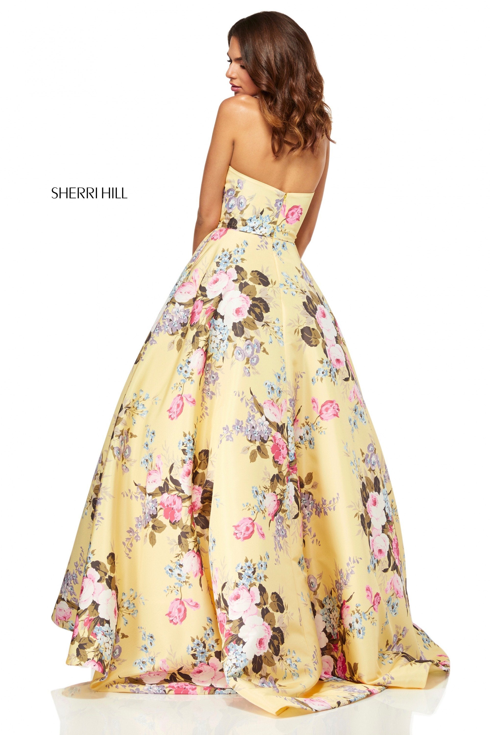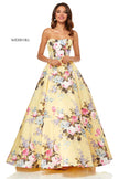 Strapless floral print ball gown.