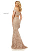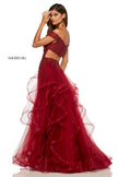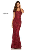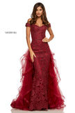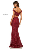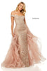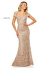 Fitted metallic lace gown with an off-the-shoulder bodice and tulle removable overskirt.