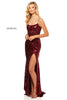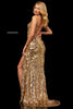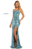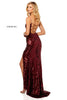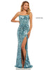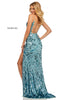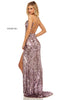 Fitted sequin gown with a slit and a lace up back.