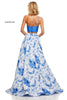 Two-piece with ivory blue print A-line skirt with a ruffled front slit and one-shoulder bodice.