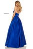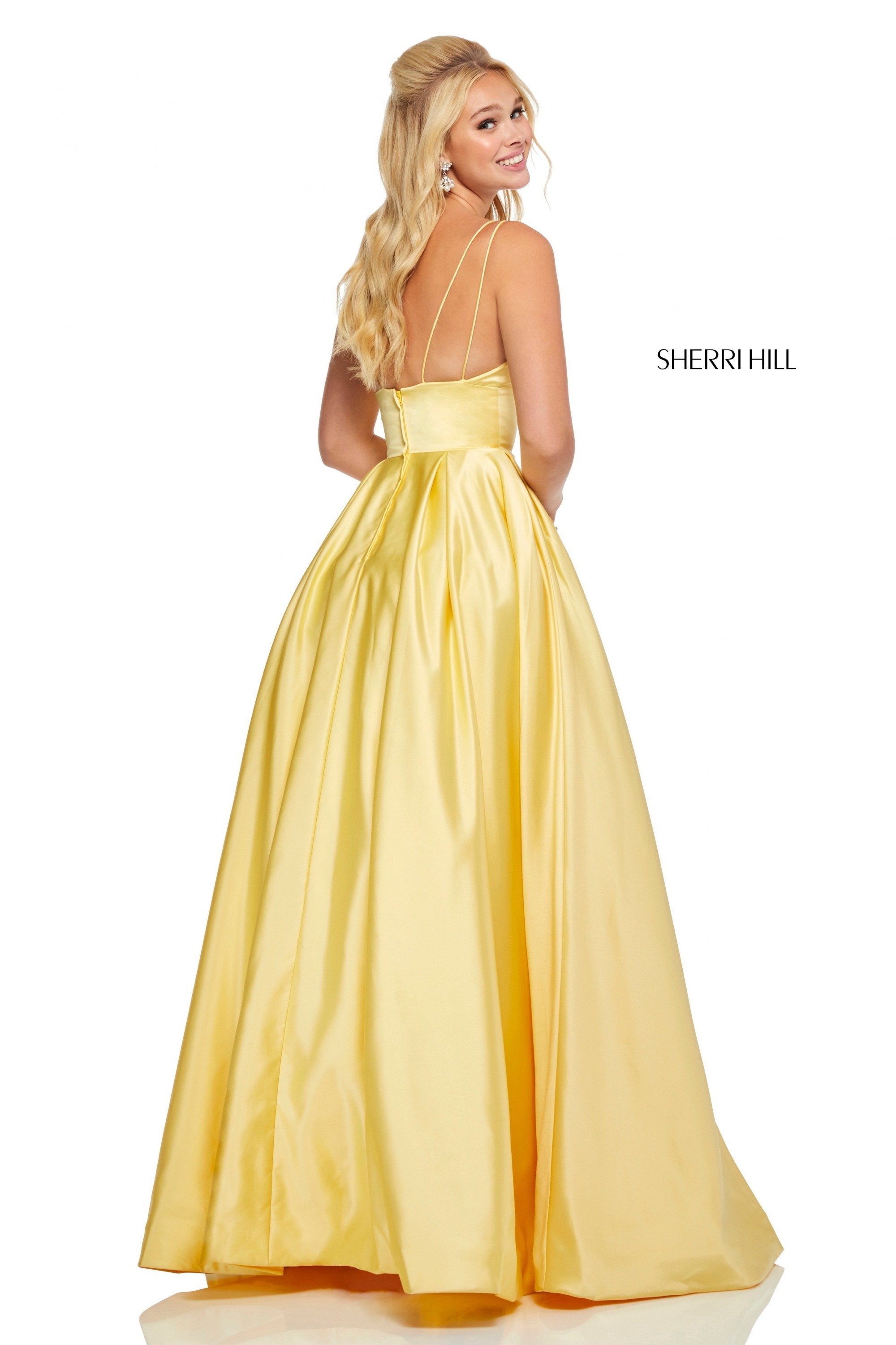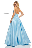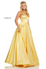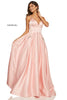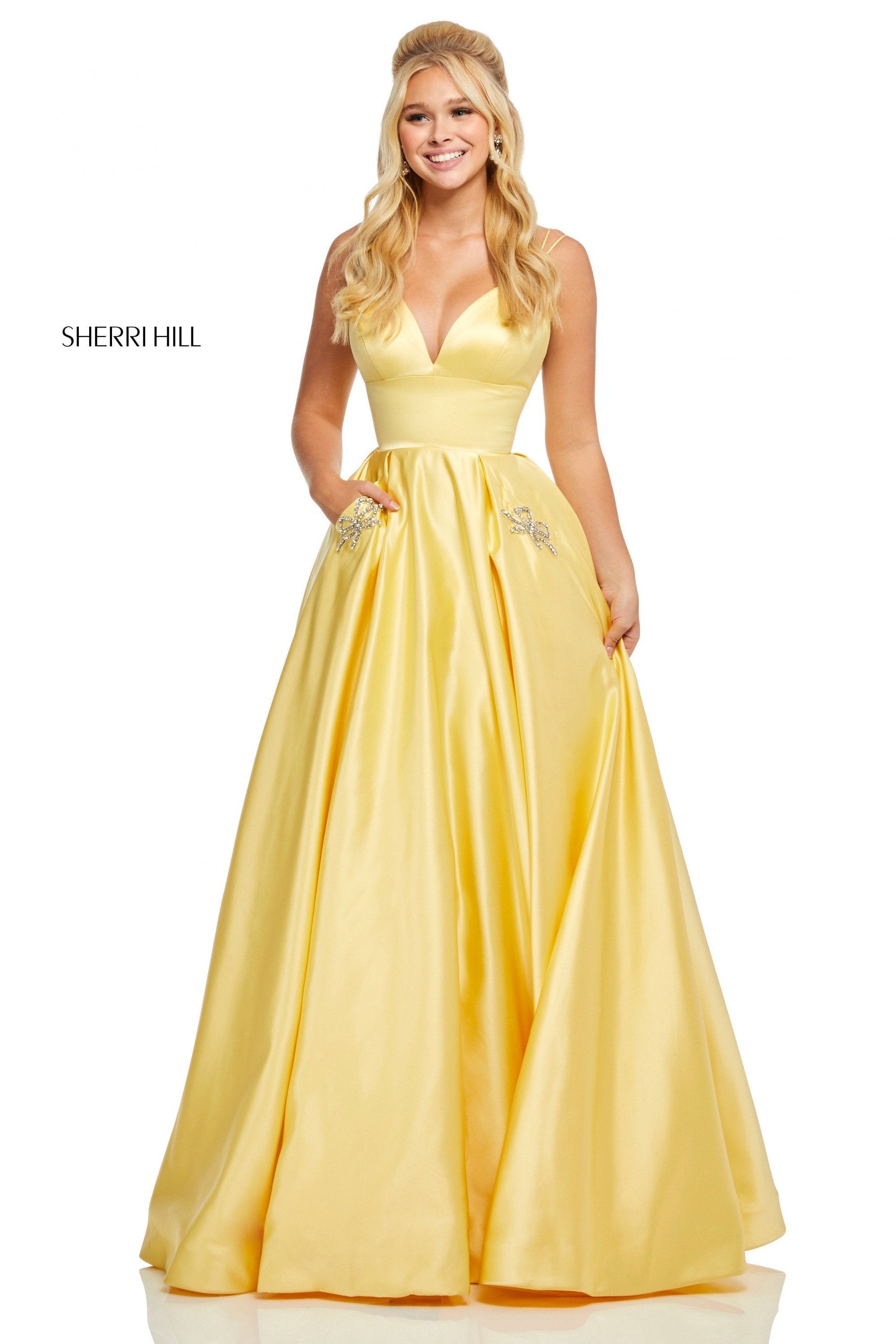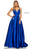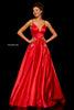 Satin ball gown with deep-V neckline and beaded bow shape pocket detailing.