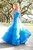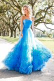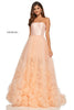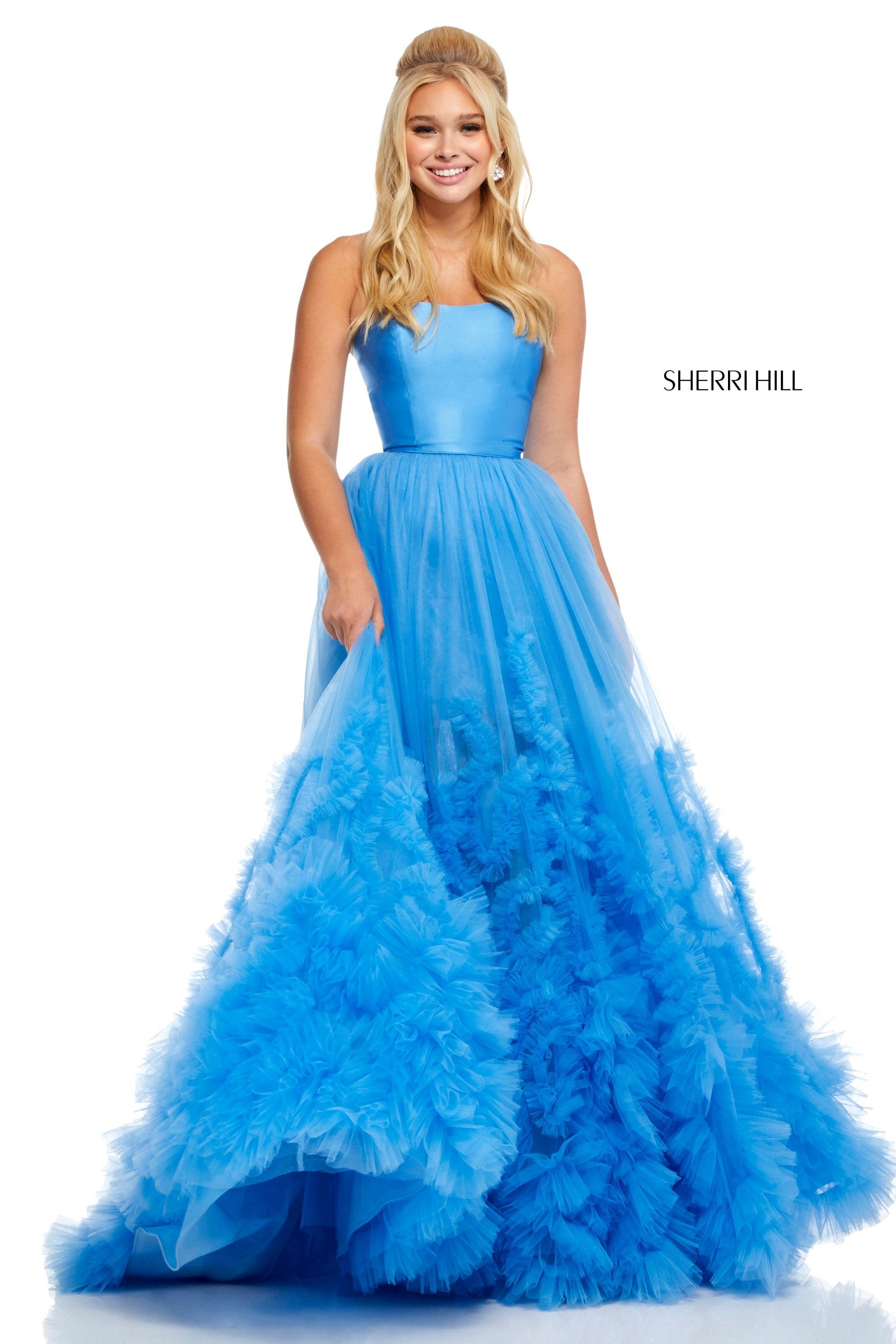 Strapless tulle ball gown with gathered embellishment on skirt and mikado bodice.