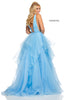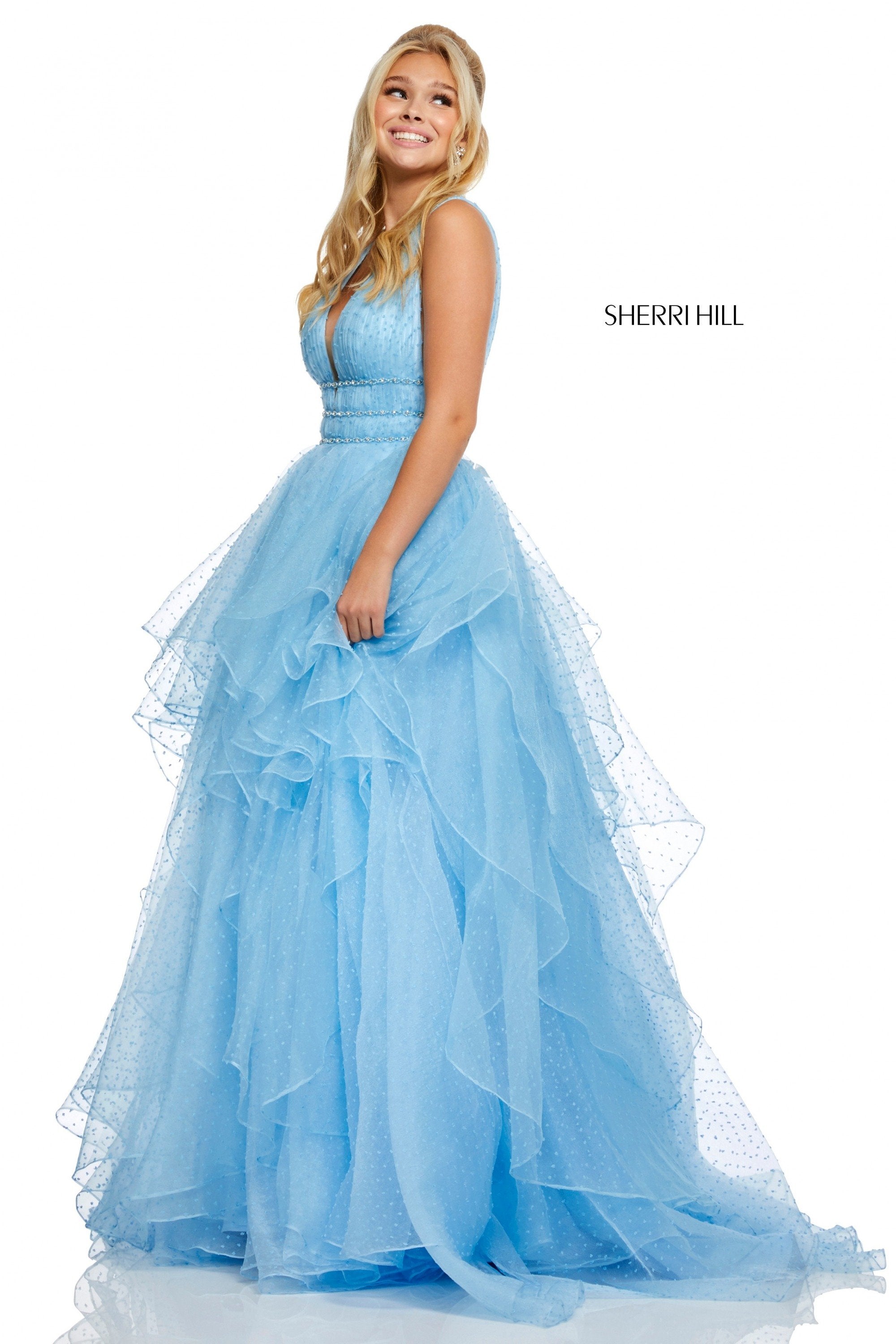 Swiss dot ball gown with layered skirt, plunging neckline, and jewel encrusted waistbands.