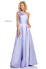 One-shoulder mikado A-line with pockets and 3D floral applique on strap.