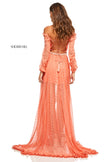 Two-piece, ruched chiffon off-the-shoulder top with quarter length sleeves and lace up back, and sheer chiffon high-low skirt with beaded waistband.