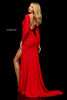 Long sleeve, low back jersey dress with rounded skirt slit and jewel detailing.