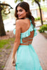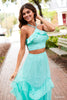 Two-piece with ruffle neckline and lace up back halter top, and chiffon skirt with metallic detail and ruffles.