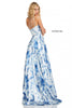 Satin one-shoulder blue and ivory print A-line with skirt slit.