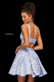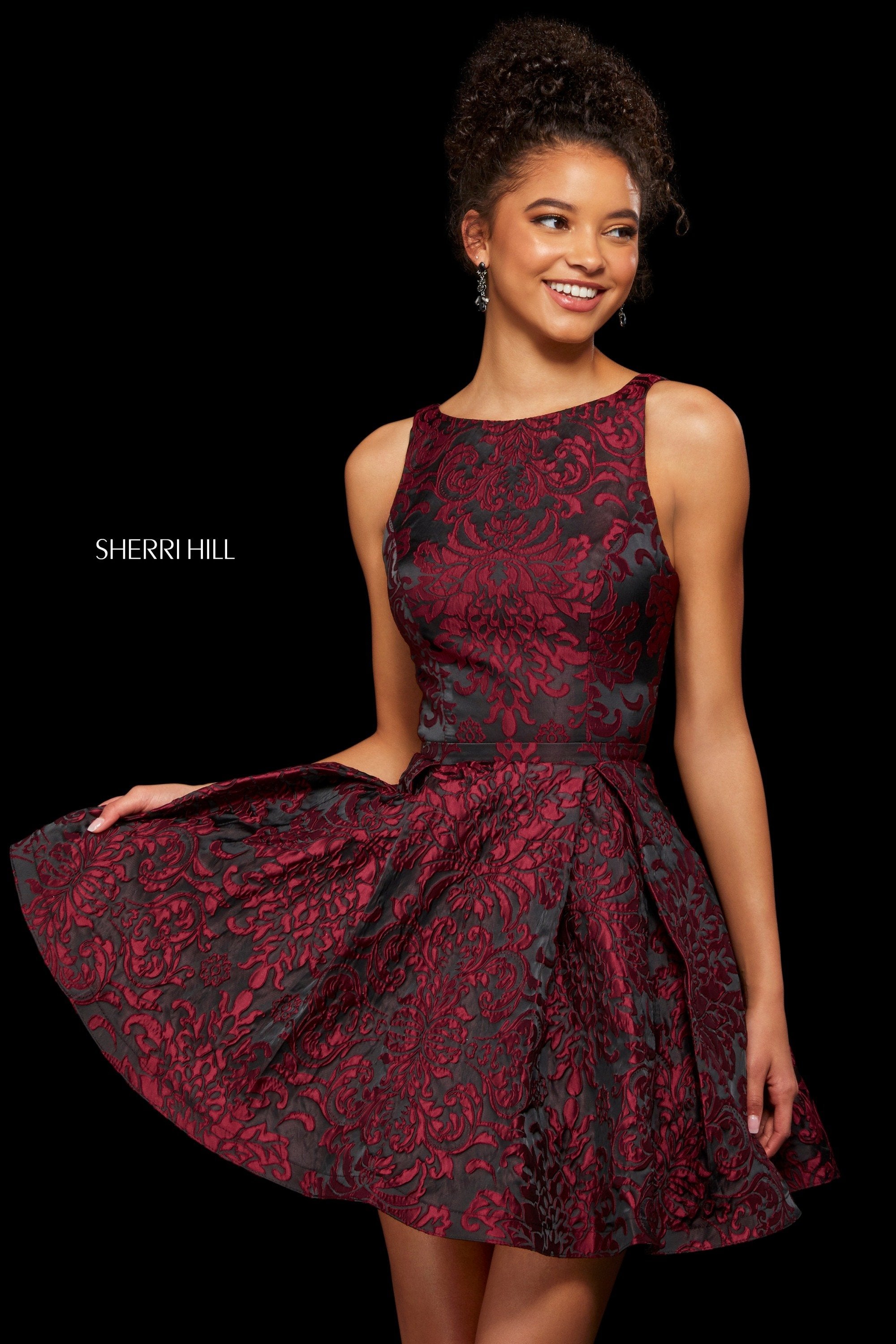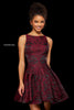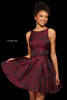 Brocade A-line cocktail dress with a boat neckline and cut out back.