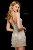 Cocktail length beaded dress with V neckline and beaded fringe at hem.