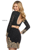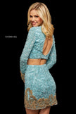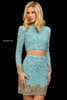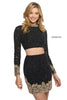 Beaded two piece with long sleeves, high neckline, open back bodice and cocktail length skirt.