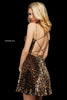 Leopard print satin cocktail dress with knife pleated skirt and open lace up back.