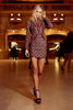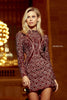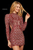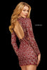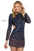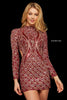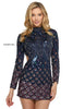 Long sleeve high neck beaded and sequin cocktail dress with side cut outs and open back.