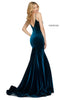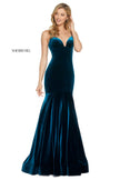Velvet mermaid gown with modified sweetheart neckline and corset style lace up back.