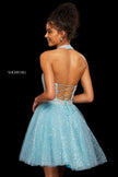 A-line cocktail dress with beaded halter neck bodice with corset style lace up back and sequin tulle skirt.