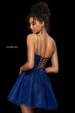 Lace and tulle cocktail dress with sweetheart neckline and corset style lace up back.