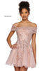 Embroidered glitter tulle A-line cocktail dress with off-the-shoulder neckline.