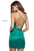 Satin cocktail dress with deep sweetheart neckline and lace up back.