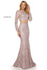 Metallic lace two piece gown featuring long sleeve bateau neckline top with lace up back, and long fitted skirt with hemline flare.