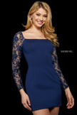 Scuba cocktail dress with beaded lace long sleeves and open lace up back.