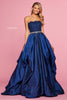 Lace strapless bodice with beaded belt with taffeta ball gown skirt.