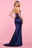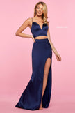 Stretch satin two piece with V neck sweetheart neckline spaghetti strap top with lace up back, and long skirt with rounded slit.