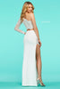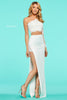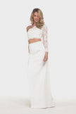 Two piece with lace one shoulder long sleeve bodice and side slit scuba skirt with lace insert.
