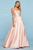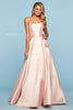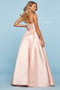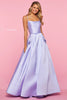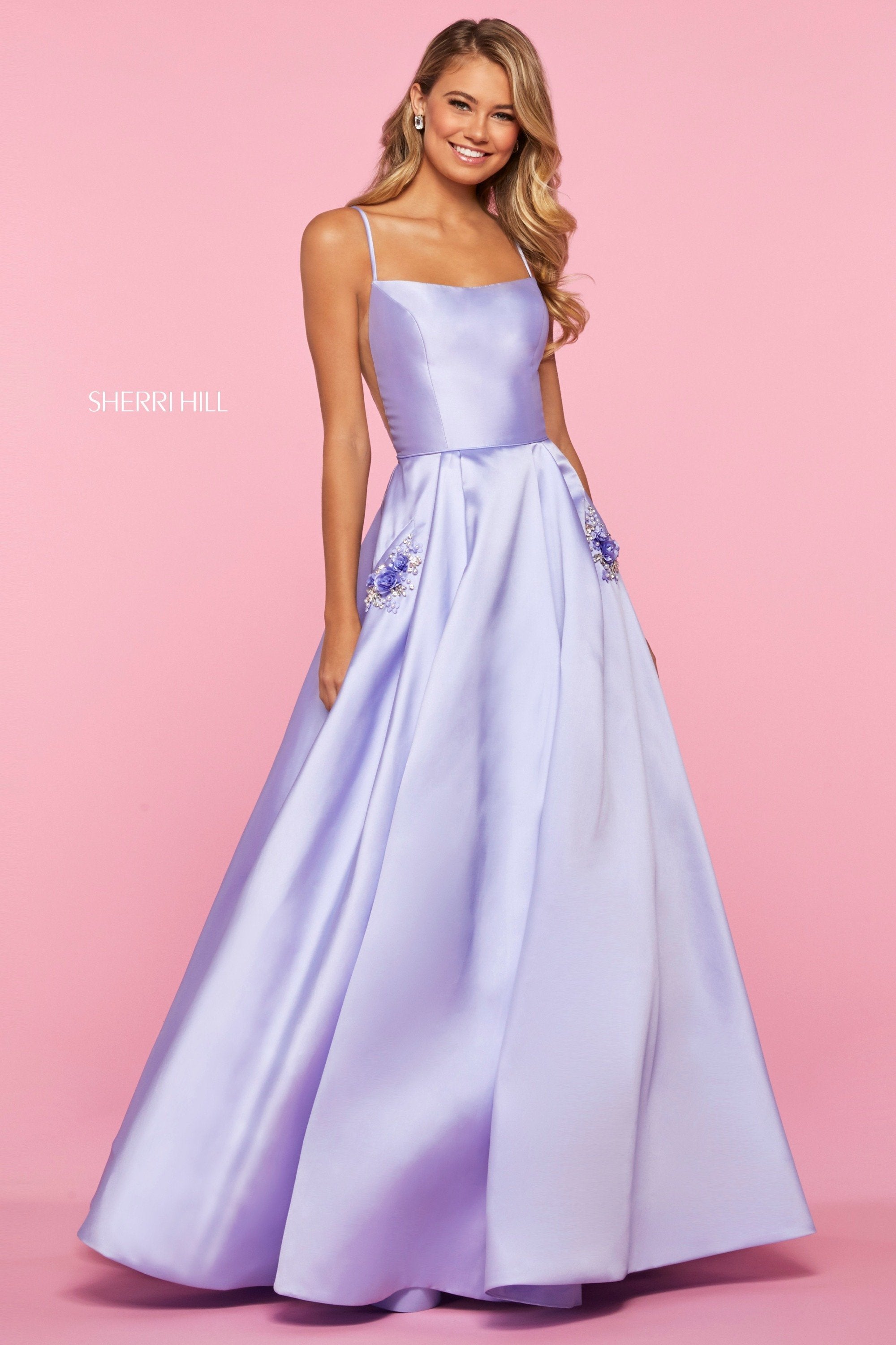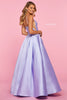 Mikado ball gown with rounded neckline, back cut out, jeweled button back, and embellished pockets.