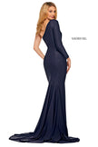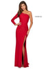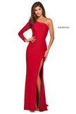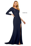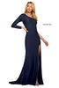 Beaded jersey gown with one shoulder long sleeve neckline and skirt slit.