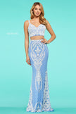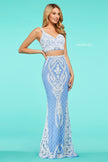 Beaded two piece with sweetheart neckline lace up back bodice and long fitted skirt.