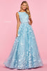 Embroidered tulle ball gown with bateau neckline, beaded belt, and bodice side cut outs.