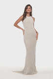 Beaded fitted gown with lace high neckline and cut out back.