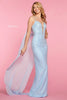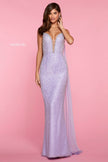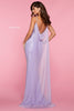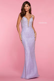 Bugle beaded fitted gown with plunging neckline and chiffon cape.