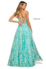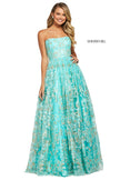 Embroidered chiffon A-line dress with strapless neckline and corset style lace up back.