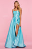 Taffeta A-line dress with skirt slit, straight neckline, spaghetti straps, and strappy open back.