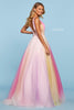Multi colored glitter tulle ball gown dress with plunging V neckline and beaded triple waistband.