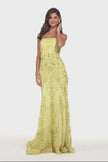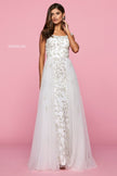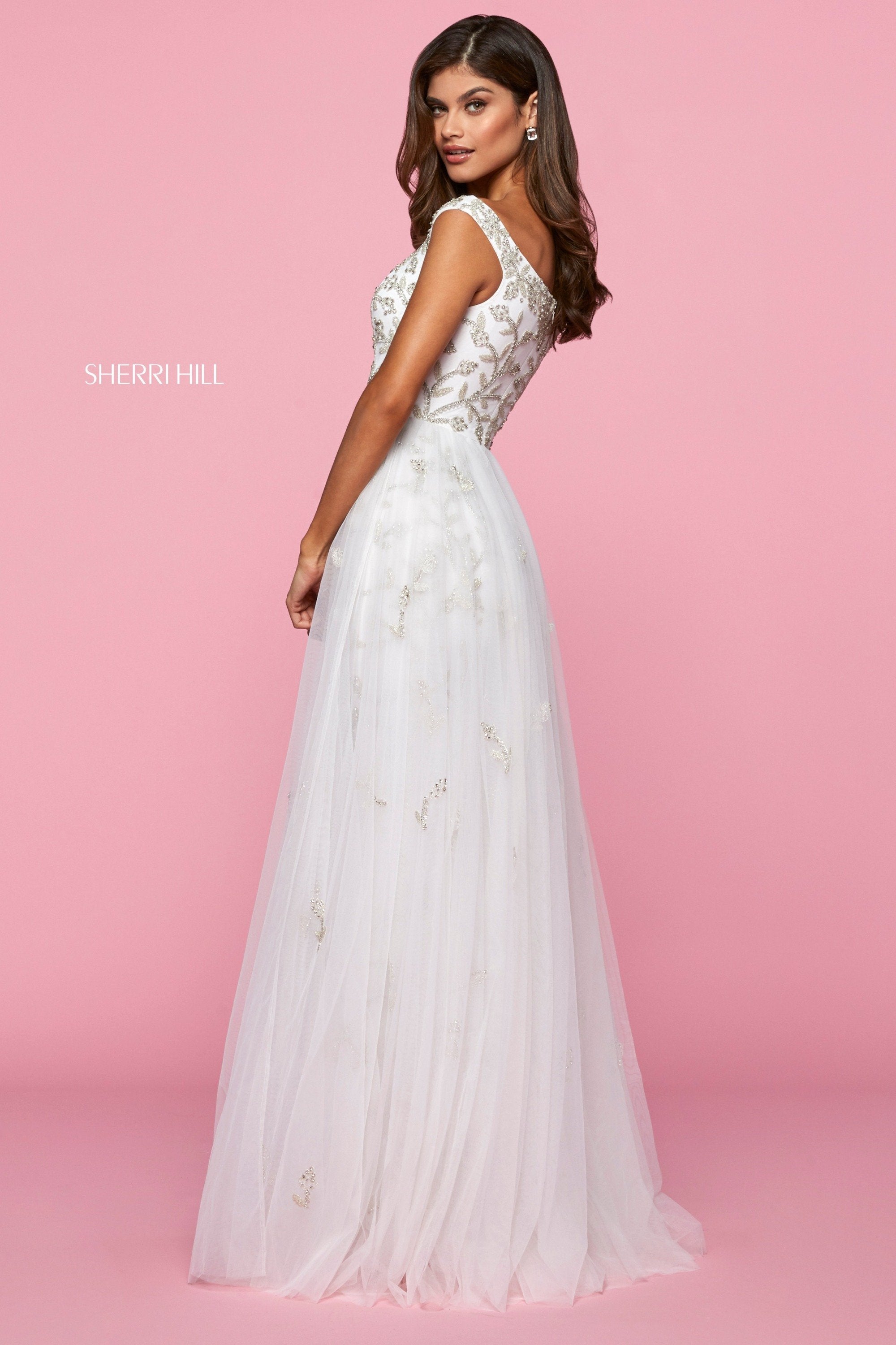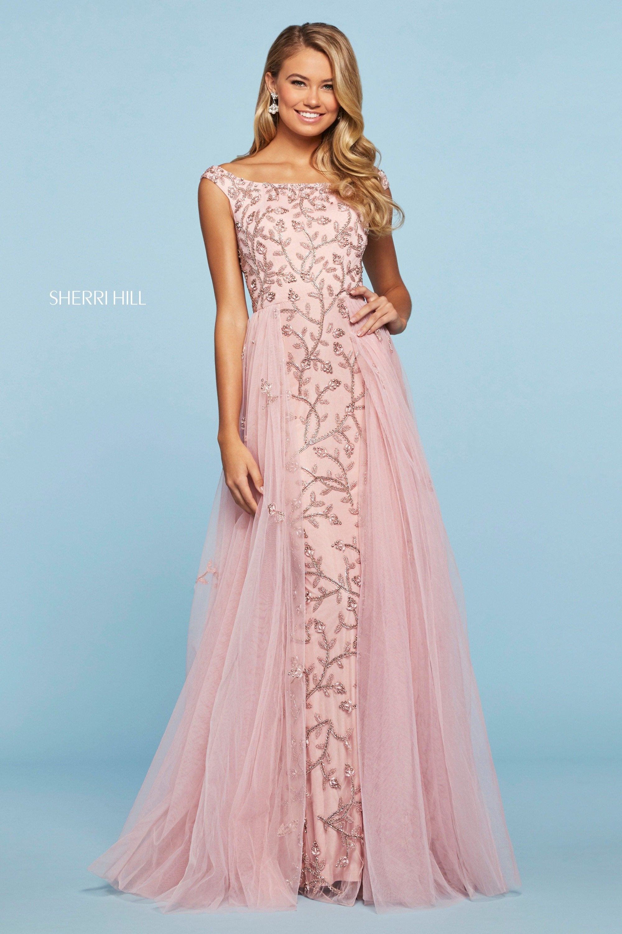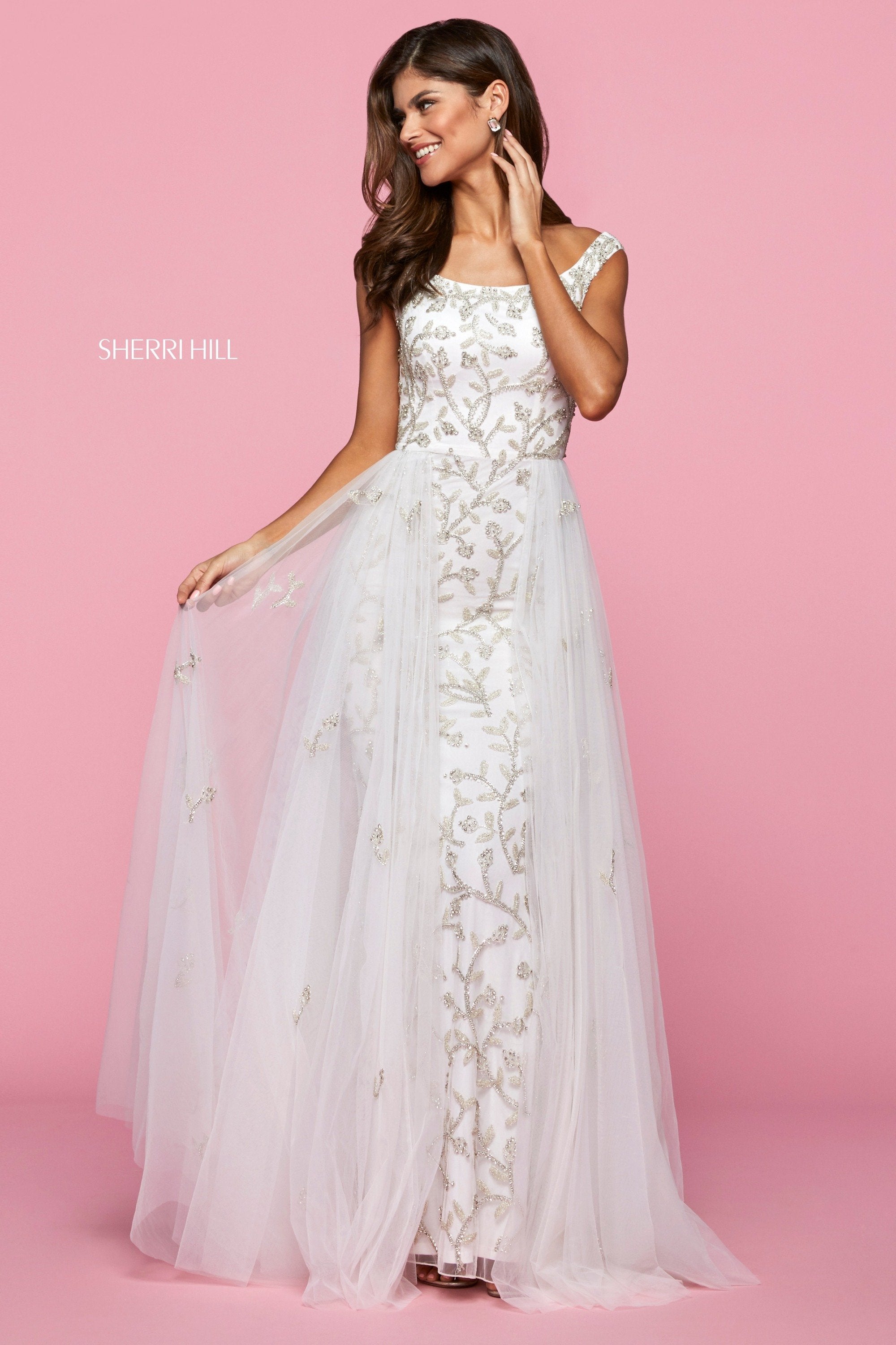 Satin and tulle gown with branch and flower pattern beading, off-the-shoulder neckline, and tulle overskirt with appliques.