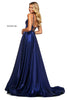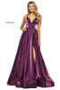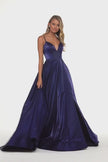 Satin back shimmer A-line with deep sweetheart neckline, corset style lace up back, and skirt slit.