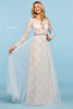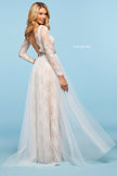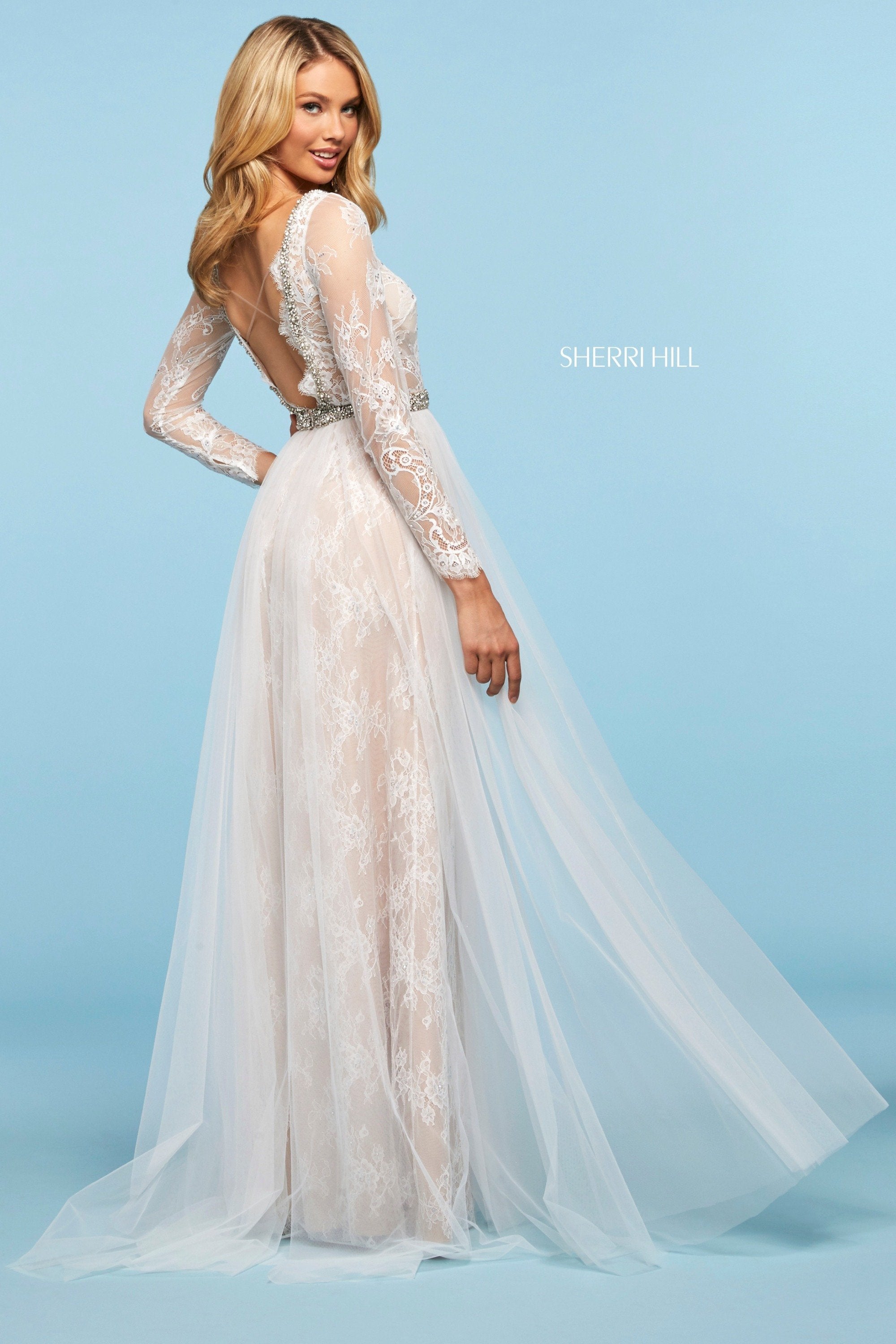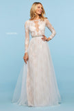 Sheer lace long sleeve bodice with open back, embellished neckline and waist, and chiffon and lace skirt.