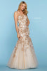Lace embroidered mermaid dress with embellished flower appliques, tulle skirt, and strappy lace up back.