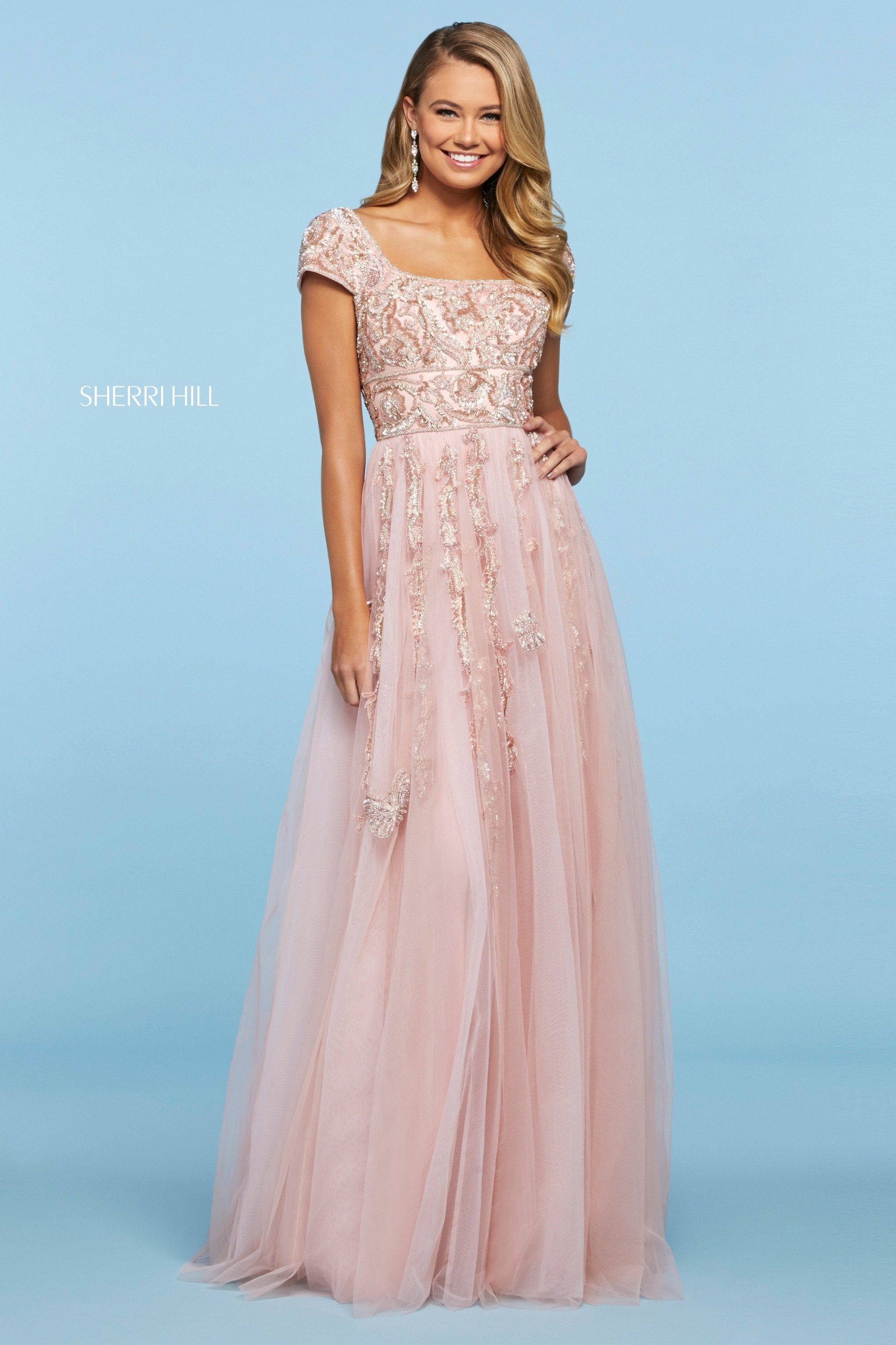 Tulle gown with beaded applique, cap sleeve bodice with straight neckline.