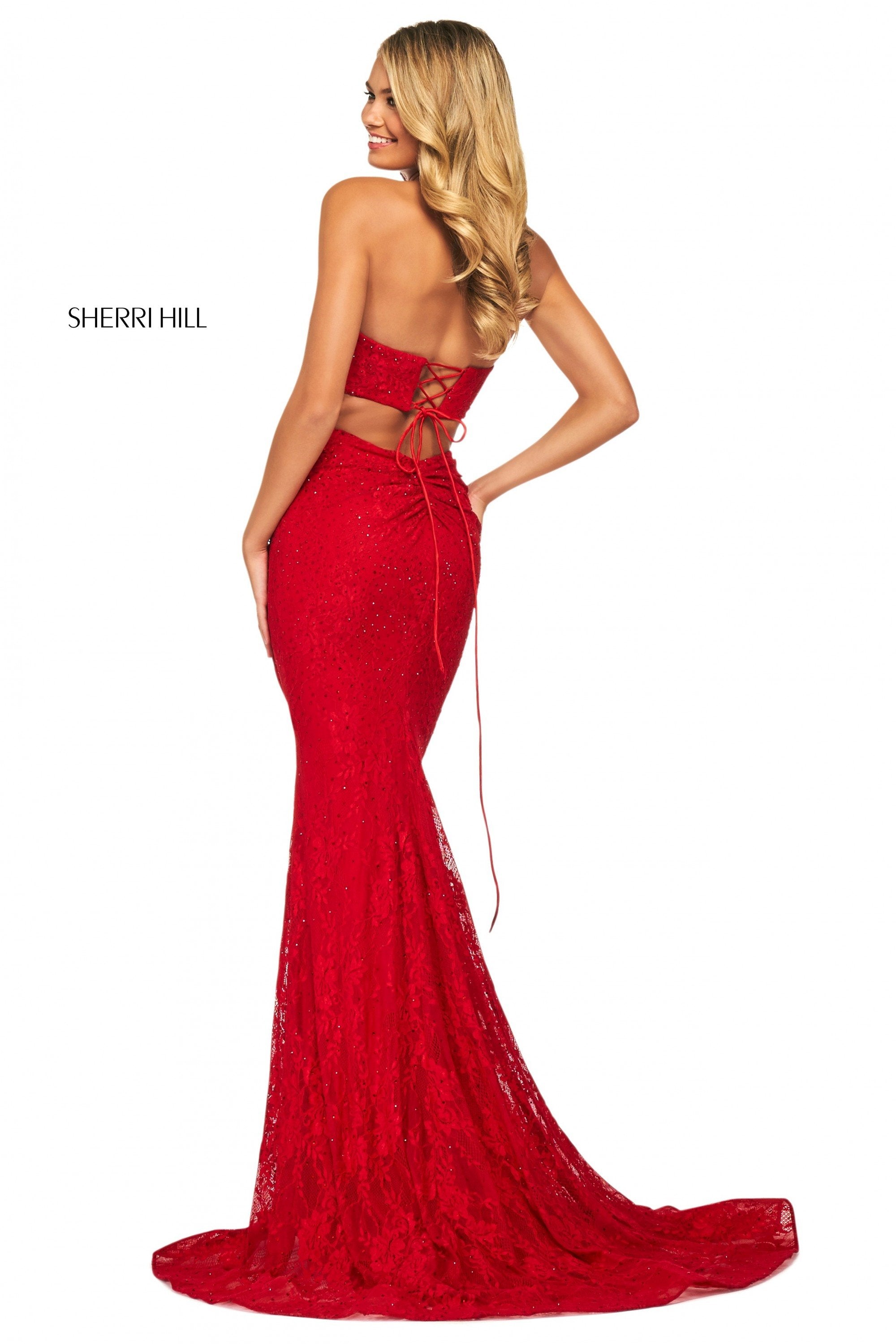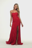Beaded stretch lace fitted gown with strapless neckline and skirt slit with back cut out, lace up back, and ruched lower back.